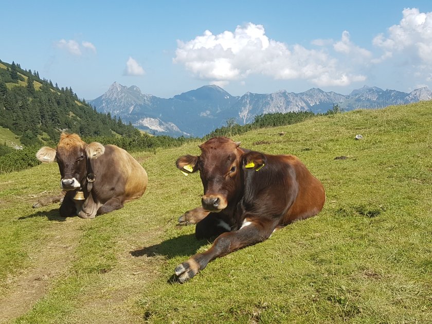 Vom Bergrücken geht es angenehm mitten durch grasende Kühe bergab zur Rossalpe (1.685 m) Heute gibt es hier leider keine Einkehr. Die Zeit drängt, da wir abends noch eingeladen sind. Es ist allerdings wirklich ursprünglich und gemütlich hier oben.