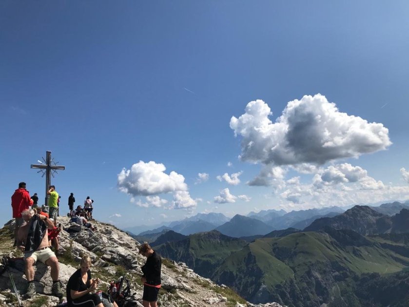Jetzt genießen wir mit vielen anderen auf dem breiten Gipfel 2.247 m)eine richtig ausgiebige Brotzeit. Herrlich – sicherlich der letzte Tag, an dem man hier ärmellos auf dieser Höhe sitzen kann. Genuss pur!