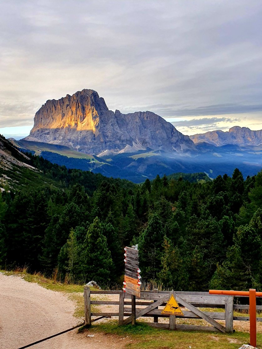 Auf dem Luis-Trenker-Weg spazieren ich auf der ehemaligen Trasse der Grödnertalbahn nach St. Ulrich hinein. Mein erster Weg führt zur Seilbahn zur Seiser Alm. Nein, ich habe mich nicht fürs Weiterlaufen entschieden, ich möchte allerdings wissen, wann die erste Bahn geht, da morgen ein langer Tag wird. Ich besorge mir noch einen Trinkschlauch, da meiner beim Packen leider nicht verfügbar war 😦 Ist halt nix, wenn man zu viele Orte hat, an denen man Zeug deponieren kann. Und aus dem schweren Rucksack jedes mal die Trinkflasche herauszuholen ist echt nix – aufwändig, umständlich und letztendlich nervtötend, so dass ich lieber Durst habe. Jetzt habe ich mir das Cafè Corso verdient. Apfelstrudel und mein Lieblingssprizz ‚Dolomitisprizz‘. Das ist der Vorteil, wenn man schon einmal da war.