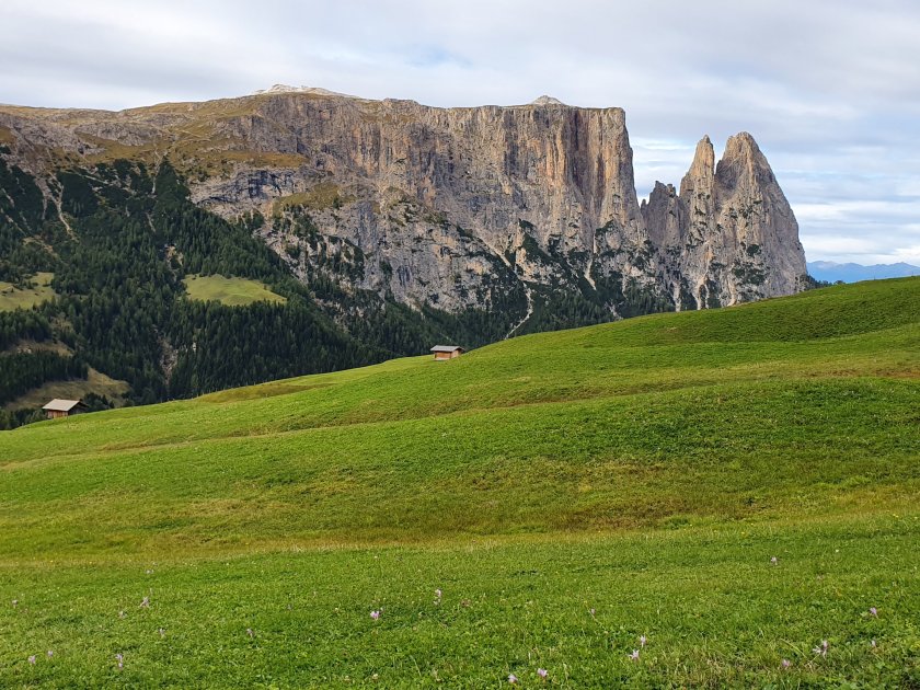 Die Seiser Alm liegt vor mir und ich muss darüber hinweg. Zuerst folge ich dem Weg Nr. 6 auf dem ich nach etwa 40 Minuten die Ritschschwaige erreiche. Hier komme ich das erste Mal ins Denken. Ich will ja über die Rosszahnscharte direkt zur Tierser Alpl und den Schlern auslassen – das ist etwas kürzer und hat 300 hm weniger. Hier lese ich jedoch, dass es bis zum Schlernhaus nur 3,5 Stunden sind. Könnte ich ja doch machen, oder?