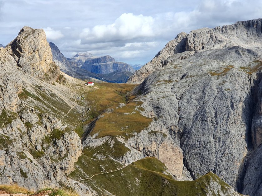 Letzte Tankstelle vor dem Schlernhaus. Ich lasse sie aus, vor mir liegt noch ein Stück Arbeit und die beginnt jetzt. Der Weg ist gut zu gehen und zieht sich in großen Serpentinen nach oben. Das Wetter wird besser und die Sicht damit auch. Ich falle in meinen bergauf-Trott – Schritt für Schritt, wenig nach oben schauen, wenig Pausen. Funktioniert auch dieses Mal, so dass in in der Hälfte der Zeit oben bin. Meine Jause habe ich mir echt verdient. Lange fällt sie jedoch nicht aus, da es zugig und auf 2.500 m auch kalt ist. Was versöhnt, ist der Ausblick auf den Rosengarten, endlich…