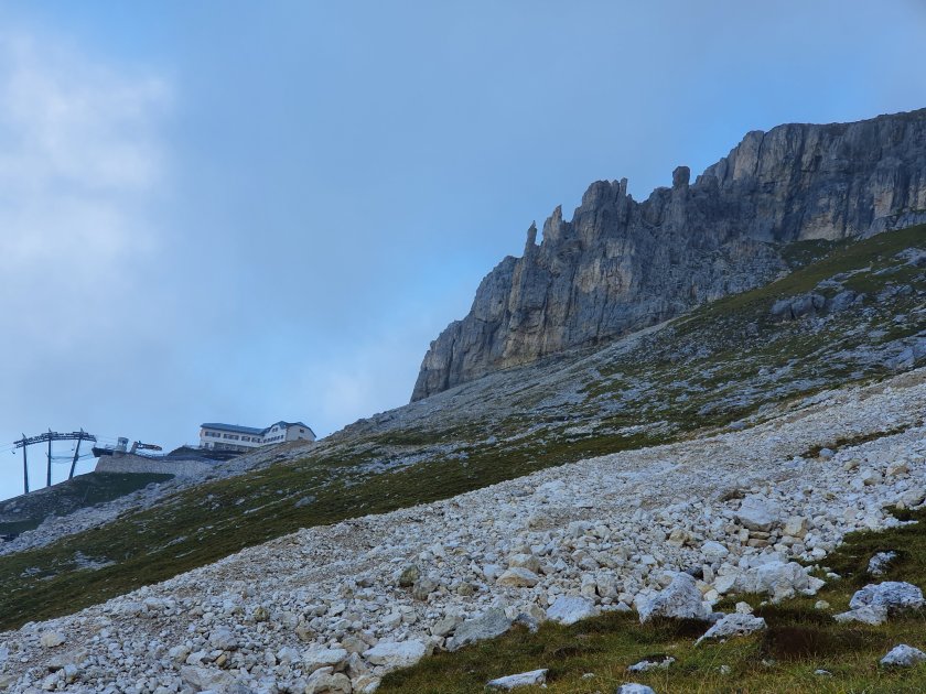 Der Weg heute ist wenig… wenig spektakulär, da Rosengarten und Latemar wolkenverhangen sind; wenig gut zu gehen, da es viel Geröll unter den Füßen ist und wenig schön anzusehen, da hier – wofür auch immer – großer Kahlschlag bei den Bäumen betrieben wurde. Aber genau dann sind es die kleinen Dinge, die zählen. Die zwei Rehe, die meine Gesellschaft beim äsen sehr lange geduldet haben. Da merkt man einfach die zwei Stunden Unterschied zum Tageswanderer. Diese Momente gibt es dann eher nicht.