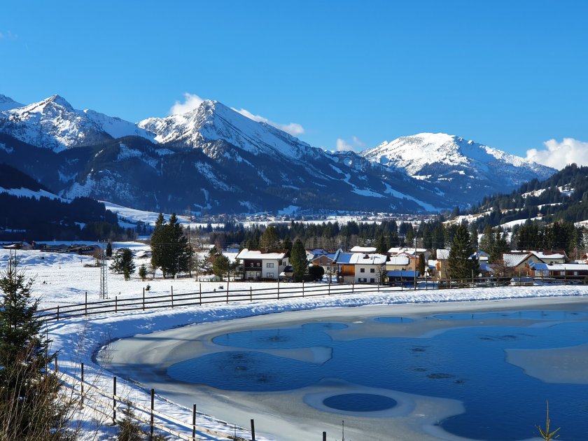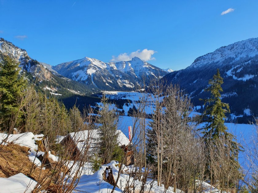 Über einen leicht verschneiten Weg laufen wir sehr entspannt nach oben. Wobei oben nicht wirklich weit oben ist. Es ist sehr entspannt und meist haben wir Aussicht auf das Tal. Es wird immer mehr Schnee und uns kommen auch Rodler entgegen. Bald müssen wir die Skipiste, die vom Füssener Jöchle kommt, queren. Die Stelle ist gut einsehbar und schmal. Es juckt auch ein bisschen in den Füßen, bei dem Traumwetter Skifahren zu gehen. Aber wenig später gibt es so wunderbare Bilder, die man beim Skifshren nicht wahrnehmen könnte: