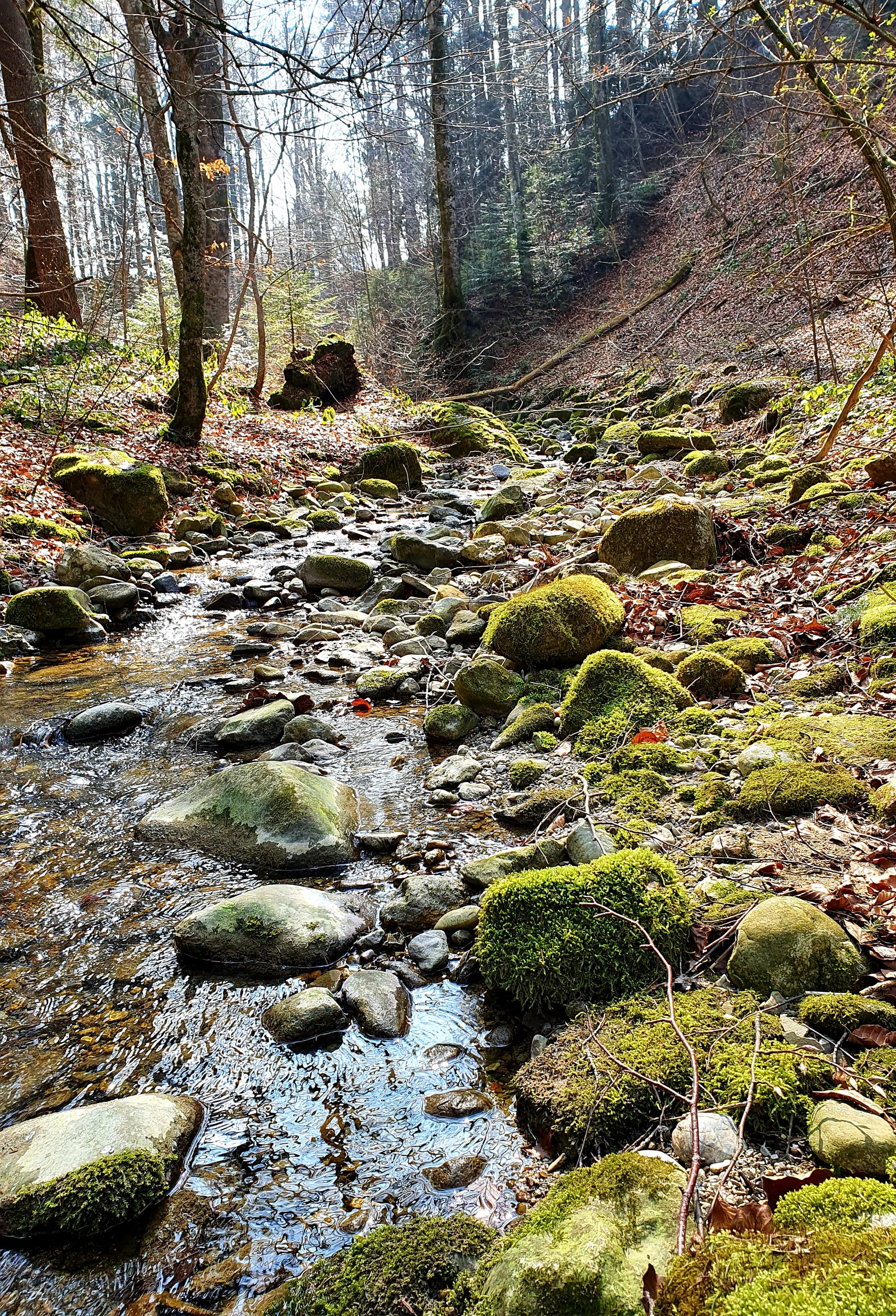 Von hier laufen wir ein Stück auf dem Sträßchen bergab, sammeln einige Zapfen für den Ofen und kommen kurz darauf nach Burgkranzegg. Ein kleines Dorf mit schönen Häusern, von dem wir doch nicht viel sehen, da wir links in einen Pfad einbiegen und entlang eines Tobels hinunter nach Petersthal laufen. Wunderschön hier, mitten im lichten Wald, immer am Wasser entlang und das raschelnde Laub des letzten Jahres noch unter den Füßen.