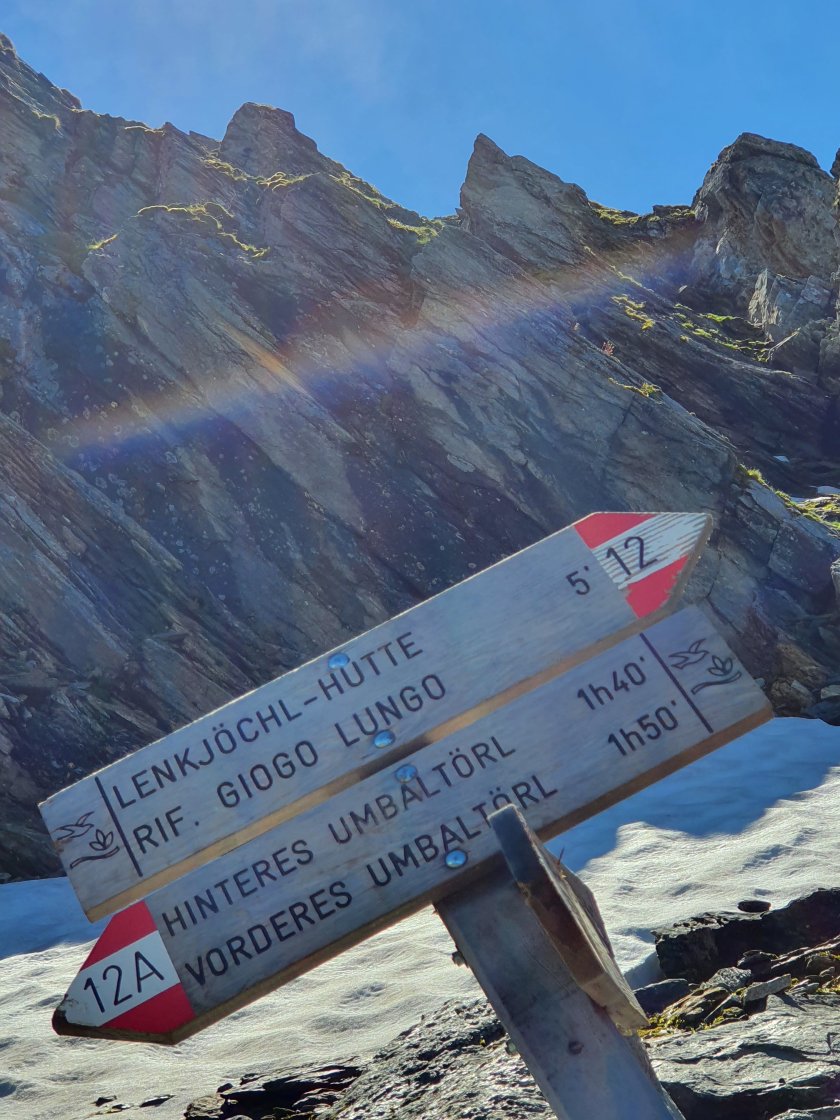 So ganz alleine durch Schlendern überwindet man keine 1.000 hm, zur Hütte müssen wir schon noch etwas Anstrengung in Kauf nehmen. Aber das wollen wir ja. Kurz vor dem Ziel steht ein Wegweiser, der meine Vermutung bestätigt: Es wäre vergleichsweise einfach gewesen, von der Clarahütte (s. 4. Etappe des Iseltrails) über das vordere Umbaltörl nach Südtirol zur Lenkjöchlhütte zu gehen. Was heißt einfach … es wäre schon eine ordentliche Bergtour mit viel Strecke und Höhenmetern gewesen. Da unsere Wanderkarte kurz hinter der Grenze endete, war ich mir nicht sicher, jetzt habe ich die Bestätigung.