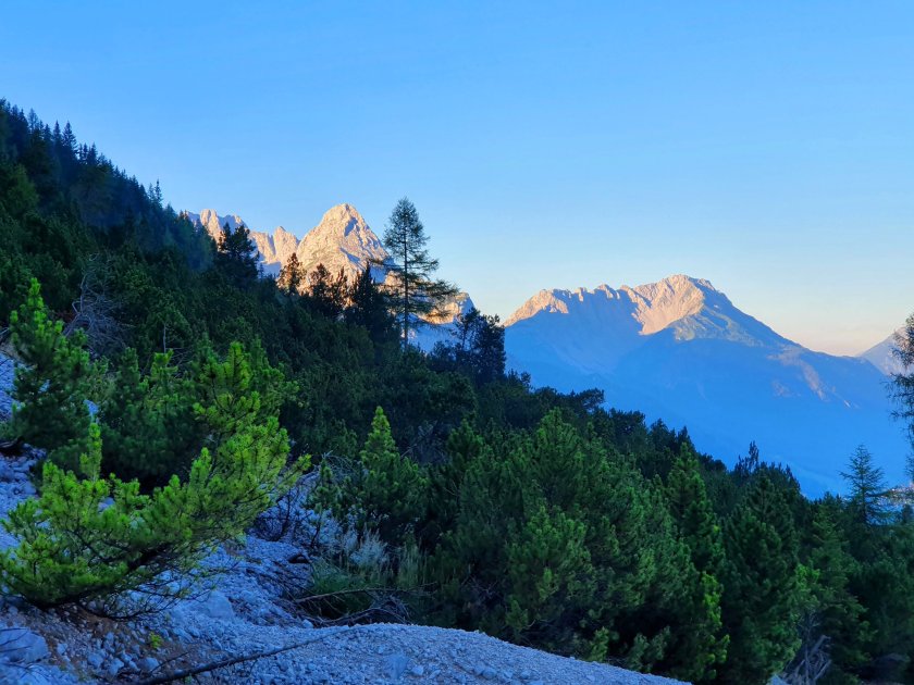 Also bin ich an unserem Hochzeitstag um 5.00 Uhr aus den Federn – nein, nicht gesprungen aber gekrabbelt und saß wenig später im Auto auf der Fahrt nach Ehrwald. Ein wunderbarer Morgen mit einem grandiosen Sonnenaufgang. Ganz langsam schlich sich bei mir doch etwas Nervosität ein – schaffe ich es allein, wie ist es im Klettersteig, ist alles so, wie ich es im Kopf habe? Alles Grübeln bringt nichts, man muss es tun. Also starte ich 6.30 Uhr am Parkplatz der Ehrwalder Zugspitzbahn und genieße die ganz wenigen nur leicht ansteigenden Meter.