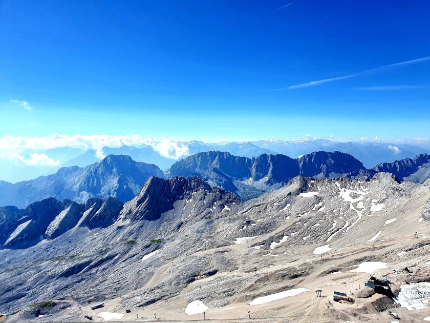 Die letzten Höhenmeter sind nicht so schnell geschafft, aber irgendwann sind sie es. Das letzte Stück ist für mich immer Quälerei, die im ‚Untergeschoss‘ der Zugspitze mit einer kleinen Brotzeit endet. Oben ist es mir definitiv zu voll, das signalisiert schon der Geräuschpegel. Ich genieße den Ausblick und die Freude der ankommenden Wanderer, es ebenfalls geschafft zu haben. Es ist trotz der vielen Menschen ein stiller Moment. Es geschafft zu haben (umkehren wäre bei der Sttecke sehr unangenehm), mir selbst ein Geschenk zum Hochzeitstag gemacht zu haben, auf dem höchsten Berg Deutschlands zu sitzen und das aus eigener Kraft.
