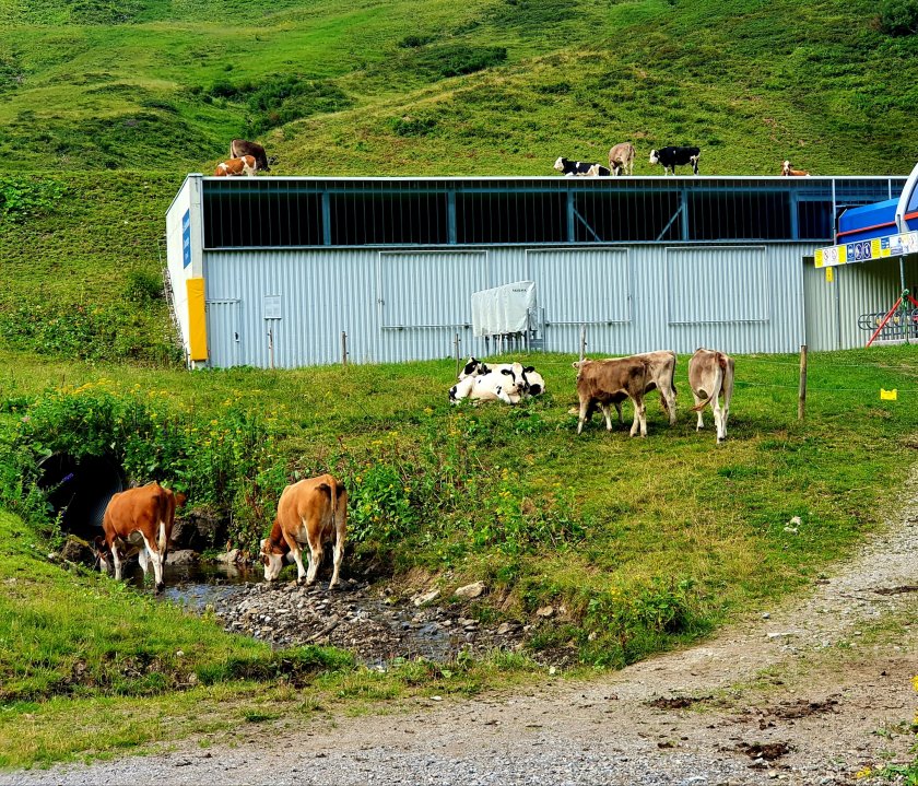 Der Skipiste folgen wir hinab zur Lift-Station der Zwerenalpe. Von oben kommend sieht es aus, als ob die Kühe auf dem Dach des Gebäudes grasen.