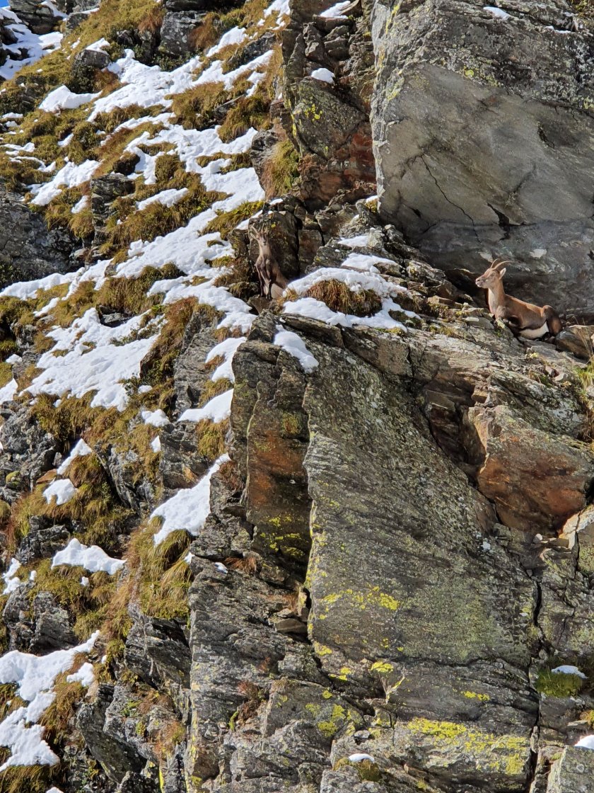 Für uns geht es jetzt in Richtung Hochgangscharte, zunächst in unendlich vielen Stufen nach oben und dann weiter in großen und kleinen Serpentinen. Ab ungefähr 2.000 m ist Schnee unser Begleiter. Erst wenig und dann doch immer mehr. Er ist ganz neu und hat guten Grip, so dass wir recht gut vorankommen. Einzig Schauen und Laufen in einem geht nicht. Es ist nicht immer ganz klar, wo der Weg aufhört und der Abgrund beginnt. Also ist konzentriertes Gehen angesagt. Irgendwann fühle ich mich beobachtet und ich lasse mal meinen Blick schweifen. Ganz berauscht entdecke ich – perfekt getarnt – zwei Steinbockweibchen kauend auf Felsvorsprüngen liegend. Ziemlich nah im Vergleich zu meinen bisherigen Beobachtungen.