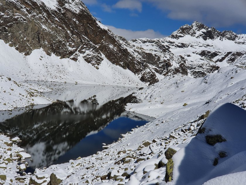 Wir sind einfach gerne da oben an den Spronser Seen – es ist anstrengend, da hinzukommen, es ist meist sehr still und verwunschen dort und es ist eine der wenigen Touren, wo es nach dem Auf nicht gleich ein Ab gibt, sondern eine Art Hochebene, über die man entlang schlendern kann.