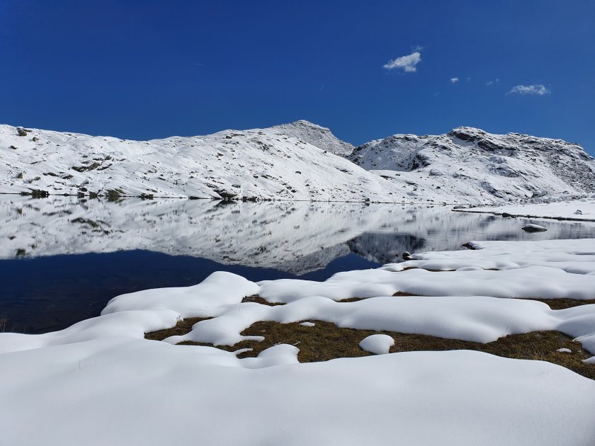 Es ist wirklich eine traumhafte Landschaft und für eine Schneeschuhtour wären es die perfekten Bedingungen – im Winter müssen wir solche Momente suchen. Nur leider haben wir sie nicht dabei.