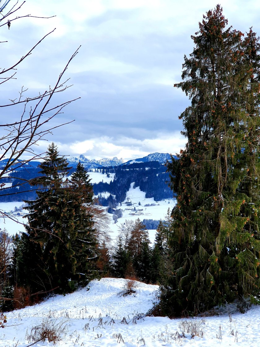 Bald verlassen wir die breiten Wiesen und gehen in lichtem Wald auf der Nordseite des Höhenzugs immer südwärts in Richtung Rottach. Es ist ein stetiges und leichtes auf und ab. Rechts kann man gelegentlich den Blick hinaus ins Illertal schweifen lassen. Auf der linken Seite gibt es Geologieunterricht mit dem Schwerpunkt ‚Nagelfluh‘. Langsam schiebt sich Rottach ins Bild. Hier ist jetzt vorbei mit leichtem auf und ab. Fast alle Höhenmeter der Runde kommen jetzt. Wir stapfen den schneebedeckten Anstieg hinauf. Auf einer sonnigen Wiese hören wir das Mittagsläuten – ein Signal. In der Sonne stehend verzehren wir unsere Brotzeit. Das ist der einzige Nachteil am Winterwandern – man muss meist im Stehen essen.