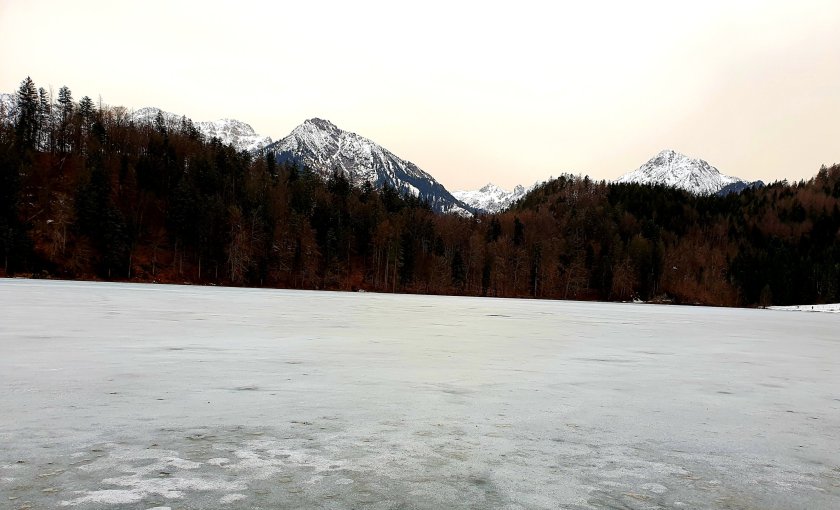Auf einigen großen Steinen am Ufer des Alatsees lassen wir uns nieder und essen eine kleine Brotzeit. Wir genießen den Blick über den gefrorenen See hinüber zu den Gipfeln in Österreich. Man kann wirklich lange sitzen, ohne zu frieren. Dennoch trennen wir uns von unserem netten Fleckchen und gehen wieder zurück. Jetzt jedoch oberhalb des Weißensees im Wald mit immer wieder schönen Blicken zum See hinunter. Hier oben rascheln die Blätter unter unseren Schuhen – das klingt nach Herbst und riecht auch so.