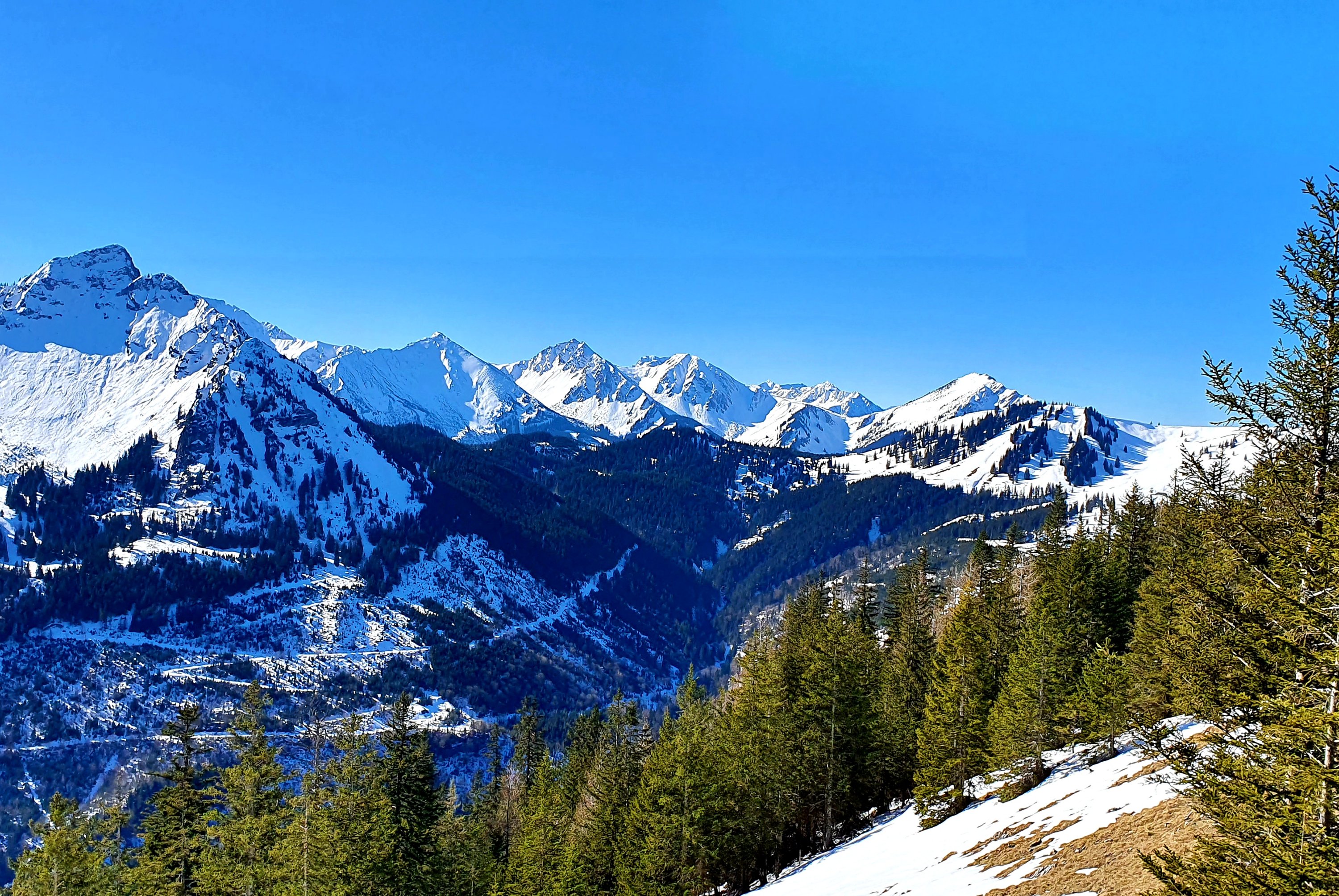 Der Himmel ist so tiefblau, wie wir es nur vom Herbst kennen, dass es noch Winter ist, merken wir allerdings beim Blick nach unten. Hier oben liegt noch ordentlich Schnee, der in der Sonne ziemlich weich wird. Wir queren, den Spuren folgend, einen langen Bergrücken. In den Latschen riecht es schon nach Sommer. Die Sonne hat Kraft und wir finden es trotz der Anstrengung einfach herrlich. Dennoch ist es kein Dahinschlendern, der Schnee erfordert Aufmerksamkeit und viel Balance.