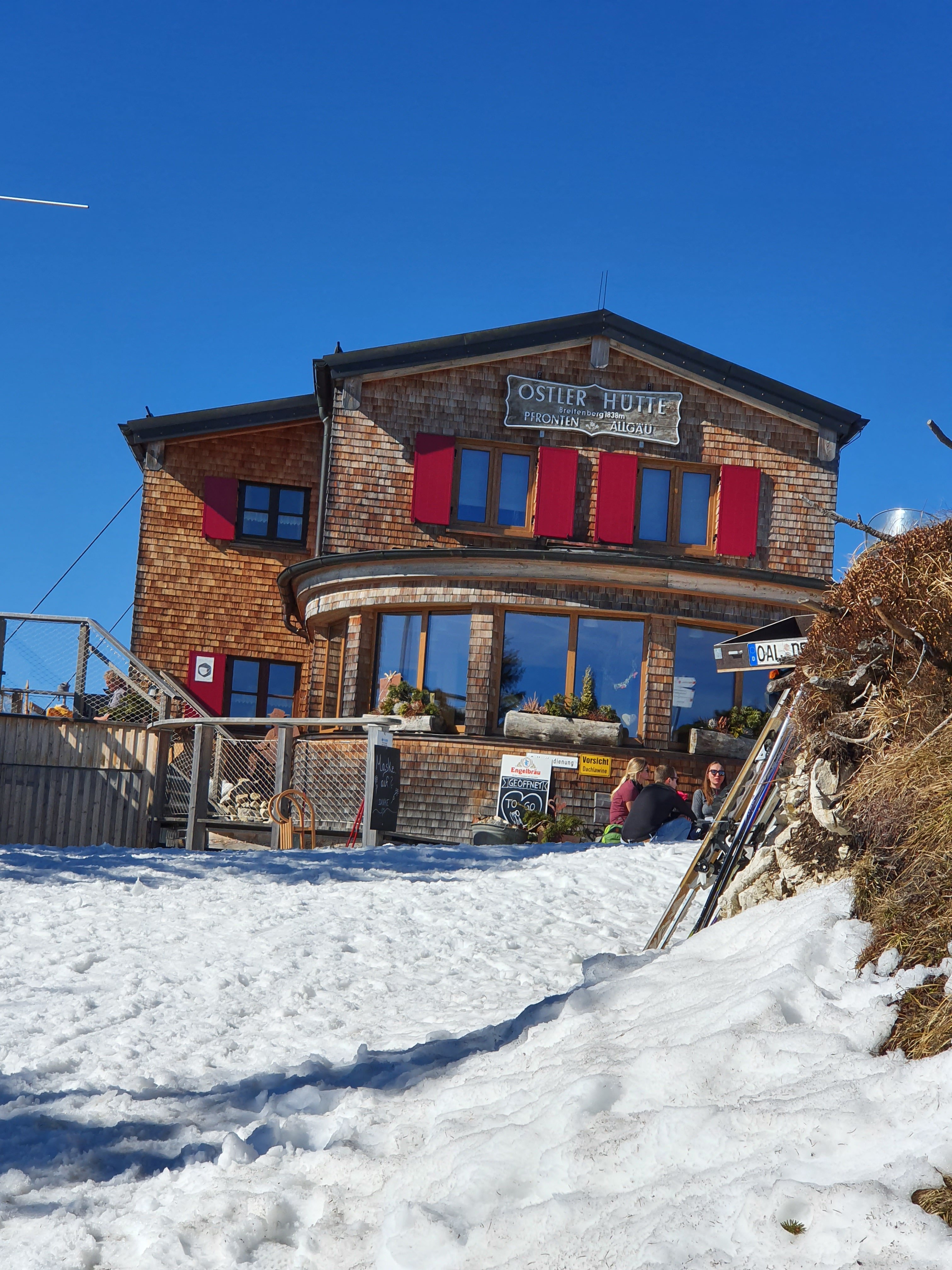 Ganz plötzlich taucht dann die Ostlerhütte vor uns auf. Es sind viele Menschen hier oben, mit Tourenski, Schneeschuhen und Rodel. Um die Hütte herum gelaufen, wartet eine schöne Überraschung auf uns: