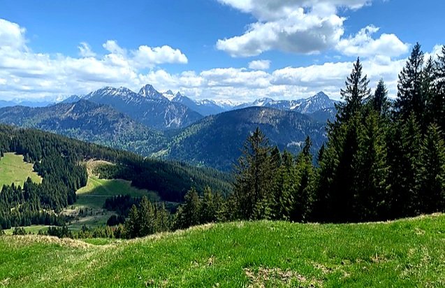 Der Start ist bekannt und nach wenigen Minuten sind wir bereits an der unteren Reuterwannenalpe. Es ist schön, endlich wieder geöffnete Alpen und Hütten zu sehen und wieder Anzeichen von Leben wahrzunehmen. Wir haben unsere Runde nicht wirklich geplant, so dass wir uns an der ersten Weggabelung recht spontan entscheiden, nach Jugholz zu marschieren. Der ausgeschriebene Panoramaweg ist wirklich eine Promenade mit herrlichem Blick auf die Berge in Oberjoch, Tannheimer Tal und gegenüber auf Grünten, Spieser und Co….