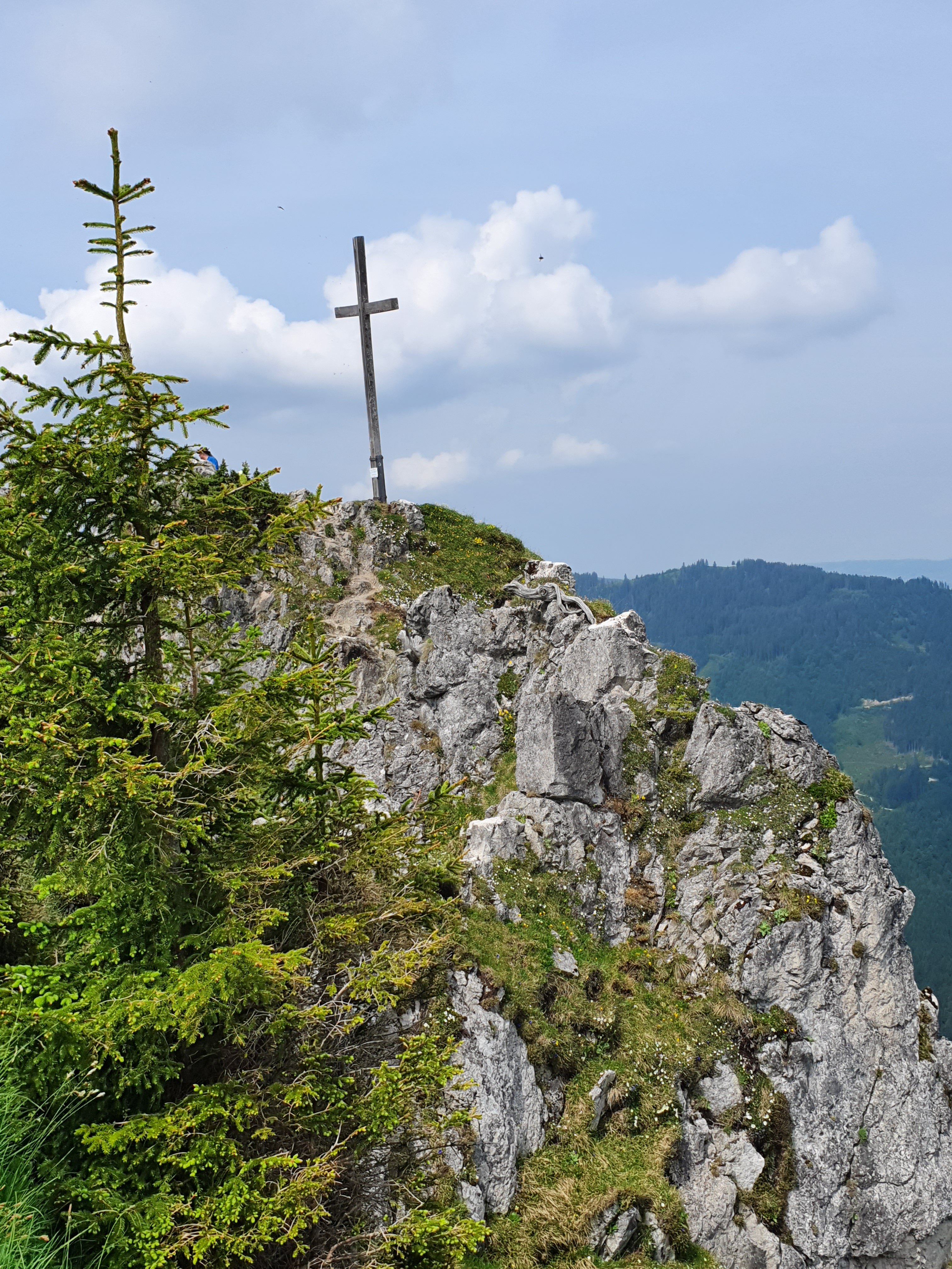 Auch wenn es vergleichsweise komfortabel aussieht – hier ist Luft anhalten angesagt und Stöcke sowie Rucksack sind schon mal allein voraus „gegangen“. Wir sind dennoch ohne Blessuren durchgekommen und laufen jetzt etwas ausgesetzt hinüber zum Sorgschrofen, der wiederum in Deutschland steht. Endlich gibt es ein verspätetes Frühstück mit schönem, allerdings diesigem Blick. Auch wenn sich die 1.600 m eher niedlich anhören – es braucht regelmäßig die Hände zum Vorwärtskommen, so auch jetzt beim Abstieg hinab nach Jungholz. Es ist anspruchsvoll, wenn auch meist nur in kurzen Passagen.