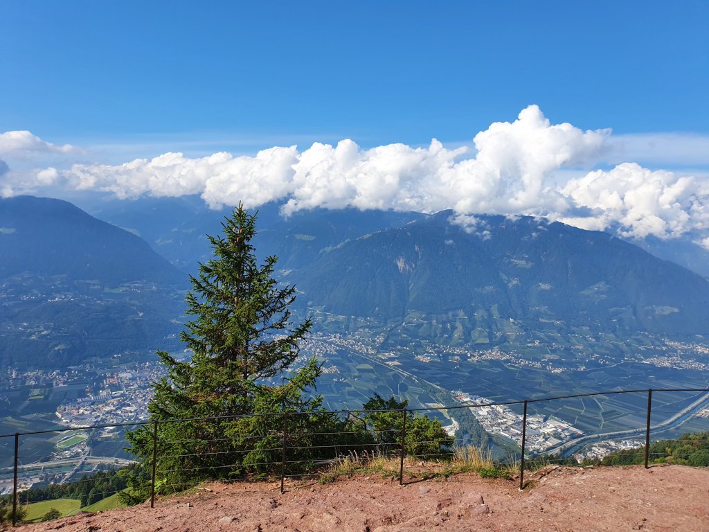Es ist wie eine Rückblende auf die vergangene Woche – wir können über das Etschtal hinweg schauen zum Gampenpass und Richtung Ultental, wo wir Dienstag und Donnerstag unterwegs waren. Ich sehe zum Vigiljoch, hinter dem sich der Naturnser Hochwart – meine Einstiegstour vom Montag – befindet. Manchmal ist es wie heimkommen, wenn ich hier von oben runter ins Etschtal, auf die Texelgruppe oder in Richtung Bozen schaue. Heute zum Beispiel, obwohl es der letzte Tag ist…
