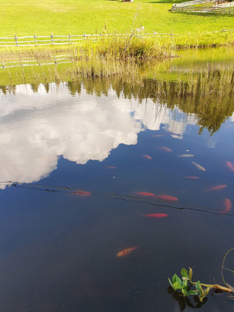 Den Anstiegsweg gehen wir wieder zurück und laufen dann bis zu den fotogenen Kühen zurück. Wenig später zweigen wir links ab und schlendern durch den Wald in Richtung Leadneralm. Es ist ein schöner warmer Herbsttag und wir genießen die Zeit zu dritt, quatschen viel und haben Spaß. Kurz vor der Leadneralm kommen wir aus dem Wald heraus und finden einen Teich voller Goldfische, seltsam hier oben.
