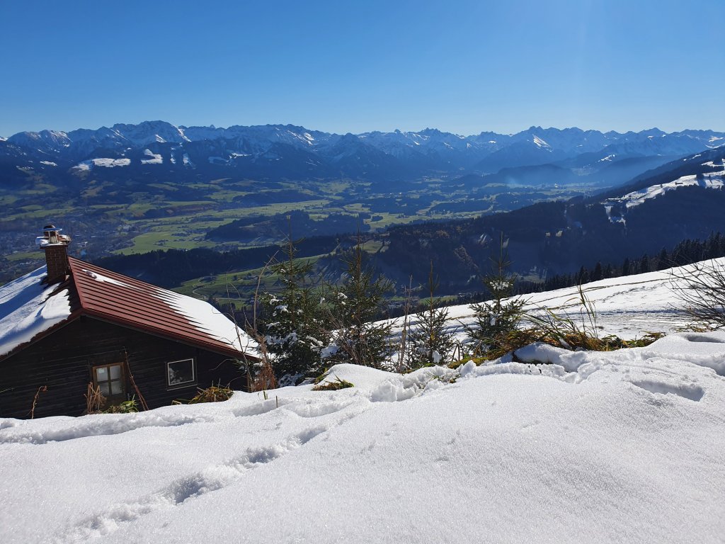 Unsere Brotzeit essen wir im Stehen, da alle Bänke vom Schnee belegt sind und planen schon für den nächsten Sommer eine gemeinsame Tour über die vielen Gipfel der Nagelfluhkette. Ehe wir zu sehr ins Träumen verfallen, steigen wir mal lieber ab. Ein kurzes Stück folgen wir dem Anstiegsweg, um dann rechts zur Alpe Oberberg zu laufen. Dann geht es über einen schneematschigen Pfad steil im Wald bergab. Hier fällt quatschen aus, da wir jeden Schritt überlegen müssen. Wurzeln, nasses und überfrorenes Laub, Schnee – ein anstrengendes Stück, was bei trockener Wetterlage im Sommer/Herbst ein Traumpfad ist. Langsam wird der Schnee weniger und der Pfad leichter zu gehen und bald nimmt uns eine herbstlich gefärbte Szenerie in Empfang und wir lassen den Winter wieder hinter uns.
