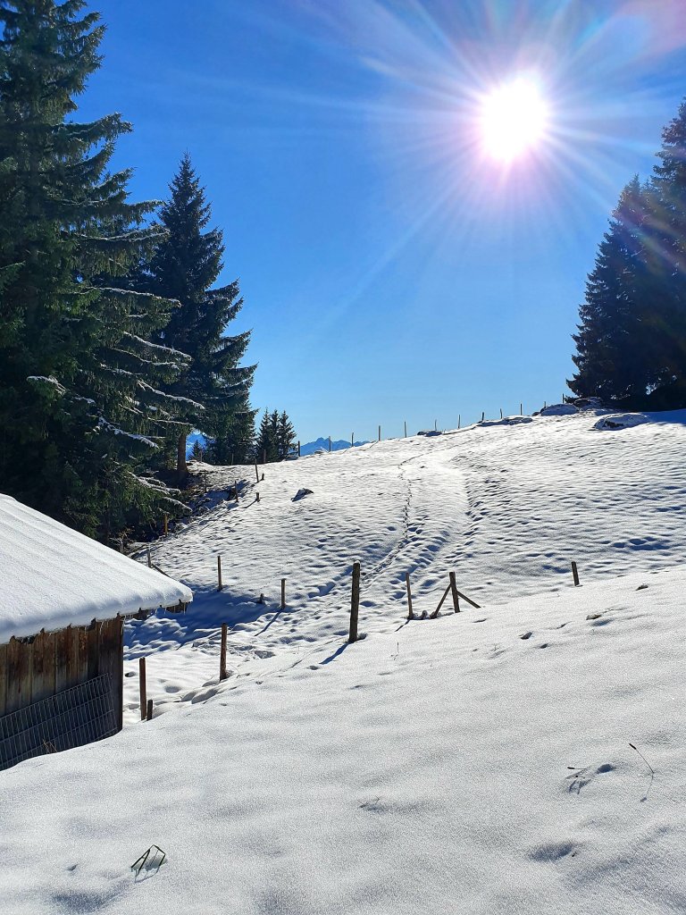 Ab hier geht es auch für uns im und auf Schnee weiter. Da es anfangs nur zwischen 5 und 10 cm sind, können wir uns gut daran gewöhnen. Der Wechsel zwischen sonnigen und schattigen Abschnitten erfordert Konzentration, da es viele vereiste Stellen gibt, die auf den ersten Blick nicht zu erkennen sind. Vorbei an der Schwanden-Alpe, die ganz neu gebaut auf einer Wiese thront, folgen wir der verschneiten Straße bergauf. Hier oben wird der Ausblick mit jedem Schritt besser und der Schnee mit jedem Schritt mehr.