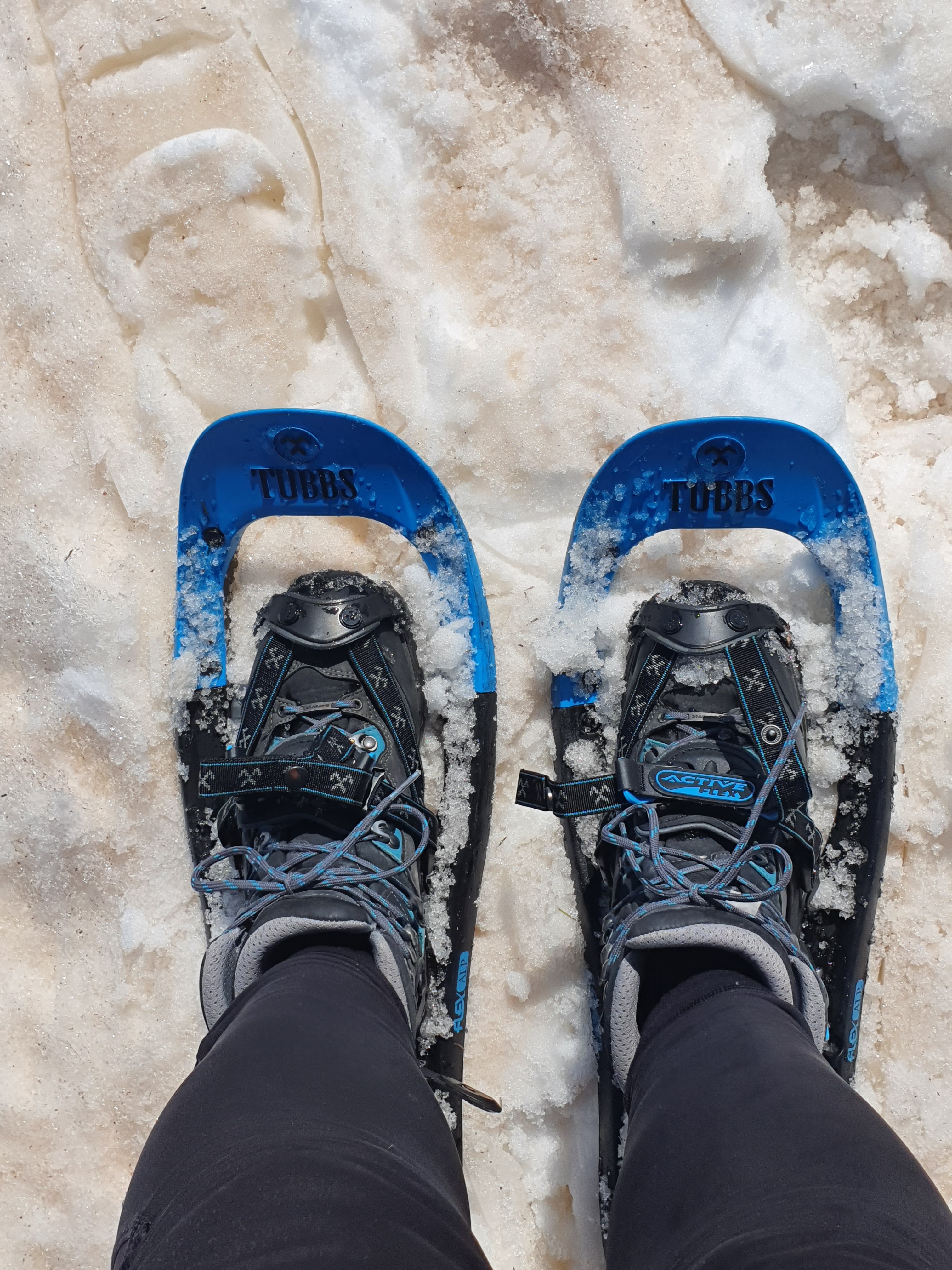 Mit Schneeschuhen ist bergab purer Spaß, da es kein Rutschen und Einsinken gibt und man überhaupt nicht darauf achten muss, wohin man den Fuß setzt. Daher können die Augen umherwandern und genießen und die Gedanken können einfach fließen. Ich liebe diese Momente – alles ist im Fluss.