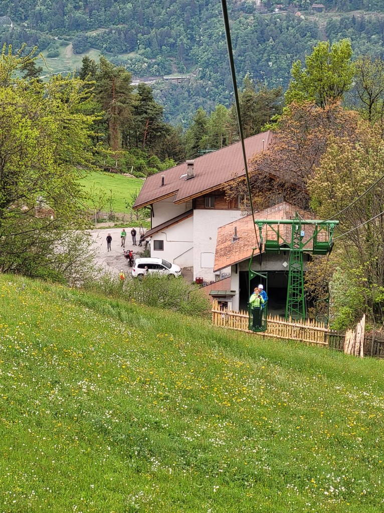 Nach einer ausgedehnten Pause steigen wir die paar Höhenmeter hinab zur Seilbahn und schweben hinab nach Dorf Tirol. Unser weiterer Plan ist, mit dem Bus bzw. mit Bussen zurück nach Algund zu fahren. Soviel zum Plan, bei dem wir nicht berücksichtigt haben, dass Sonntag ist. So warten wir bereits – jetzt im Regen – bei der Talstation der Seilbahn etwas länger auf den Bus, um dann bei genauem Lesen des Fahrplans festzustellen, dass Sonntags ein ausgedünnter Fahrplan gilt. Also laufen wir ins Zentrum von Dorf Tirol zum Busbahnhof. Dort erwartet uns das gleiche Spiel – 40 Minuten Wartezeit. Da mangelt es uns allen an Geduld.