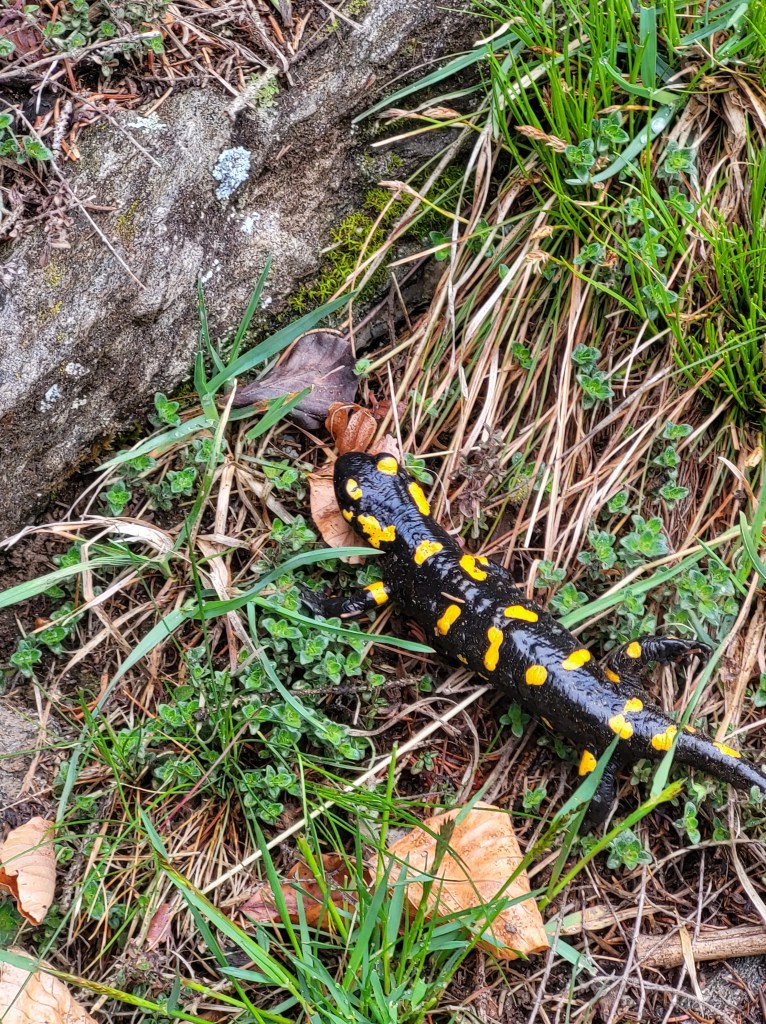 Oben angekommen laufen wir die paar Meter zu Leiteralm und dann auf dem Hans-Frieden-Felsenweg hinüber zu den Muthöfen. Man sollte nicht schauen und laufen, da es auf der rechten Seite steil bergab geht, aber so ‚ausgesetzt‘ wie oft beschrieben ist es nicht. Da es an den letzten Tagen häufig geregnet hat, ist der sonst sehr sandige, staubige Weg sehr gut zu gehen. Zudem hätten wir den kleinen Gesellen bei trockener Hitze auch nicht gesehen: