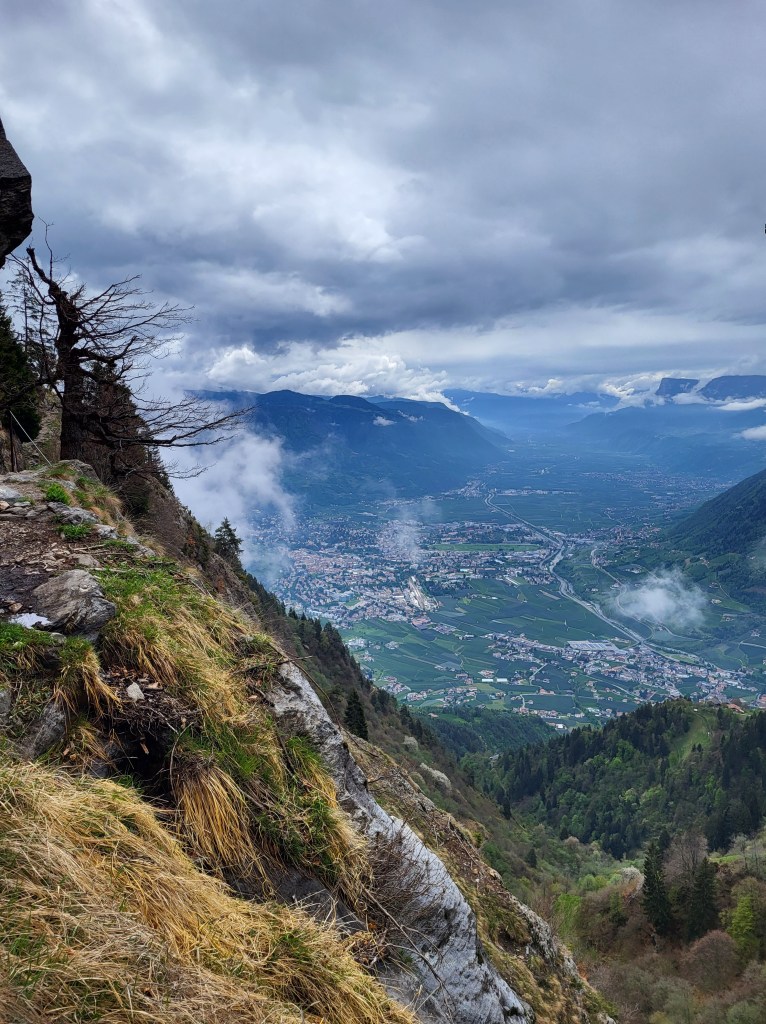 Wir laufen dann also zurück nach Algund – das ist noch ein ordentliches Stück. Nachdem wir aus dem Ort raus in Richtung Schloss Tirol unterwegs sind, zweigt plötzlich ein Weg steil nach links unten ab – Algund steht drauf. Das machen wir…