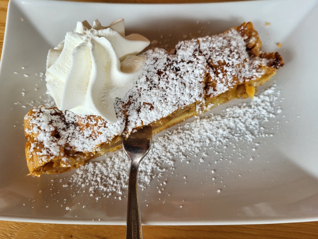 Wir laufen den gleichen Weg zurück und kehren im obersten Gasthof an der Bergstation der Seilbahn von Dorf Tirol, dem Gasthaus Steiner, ein. Endlich bekomme ich meinen heißgeliebten Apfelstrudel und danach futtere ich mich quer durch alle Teller der family. Die kennen mich ja 😉
