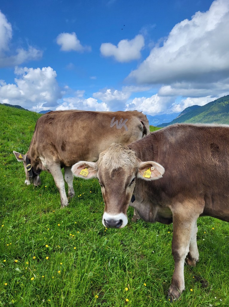 Wir parken am Moorbad und laufen von dort in Richtung Tannheimer Tal bis zur letzten Bergbahn und von dort noch weiter im Tal gen Osten. Als die Grenzwiesbahn schon einige Zeit hinter uns liegt, werde ich doch etwas unruhig. Haben wir doch einen Hinweis übersehen? Nein, haben wir nicht. Etwas später teilt sich der Weg und für uns geht es bergan. Erst auf einem schmalen Sträßchen, dennoch mitten im Wald und durch Kuhweiden. Das zieht sich angenehm ansteigend bis zur hinteren Wiedhagalpe.