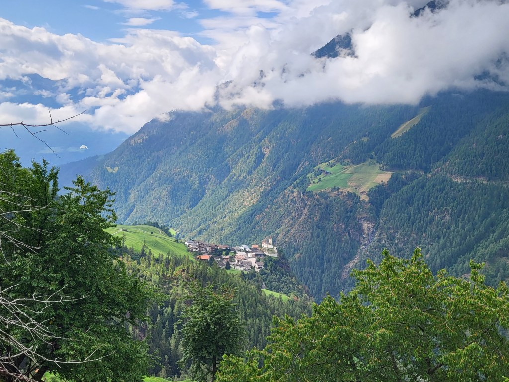 Etwas südlich von Karthaus biegen wir ins Schnalstal ein und laufen, meist auf schönen Waldwegen im Schatten auf St. Katharinaberg zu. Hoch oben auf einer Wiese machen wir ein Obstfrühstück und genießen den Blick.