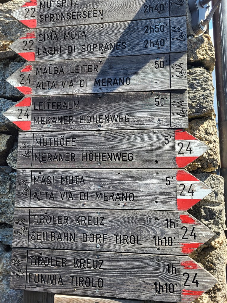 Wir fahren hinüber nach Dorf Tirol und stellen unser Auto in die Garage der Bergbahn. Zum Glück geht der Meraner Höhenweg oben los und wir können noch guten Gewissens die Seilbahn nehmen. Aber auch das ist leichter gesagt als getan – die Schlange ringelt sich über den halben Parkplatz. Ich bin froh, dass wir heute nur eine sehr kurze Strecke vor uns haben und es auf eine Stunde hin oder her nicht ankommt. Letztendlich geht es schneller als erwartet und kurz vor 11.00 Uhr sind wir oben bei den Muthöfen (1.400 m), wo wir unsere Tour heute beginnen.
