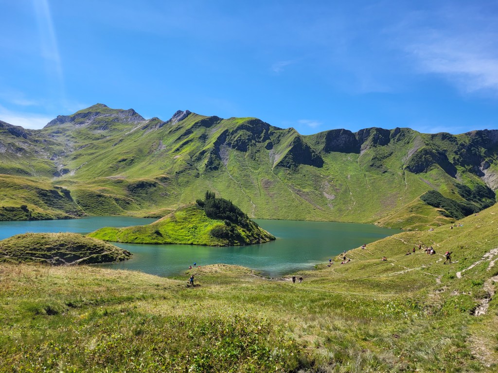 Weiter geht es, jetzt unanstrengend, im leichten Auf und Ab auf der Höhe. Noch ein paar Kurven und dann ist er plötzlich da, der Schrecksee.