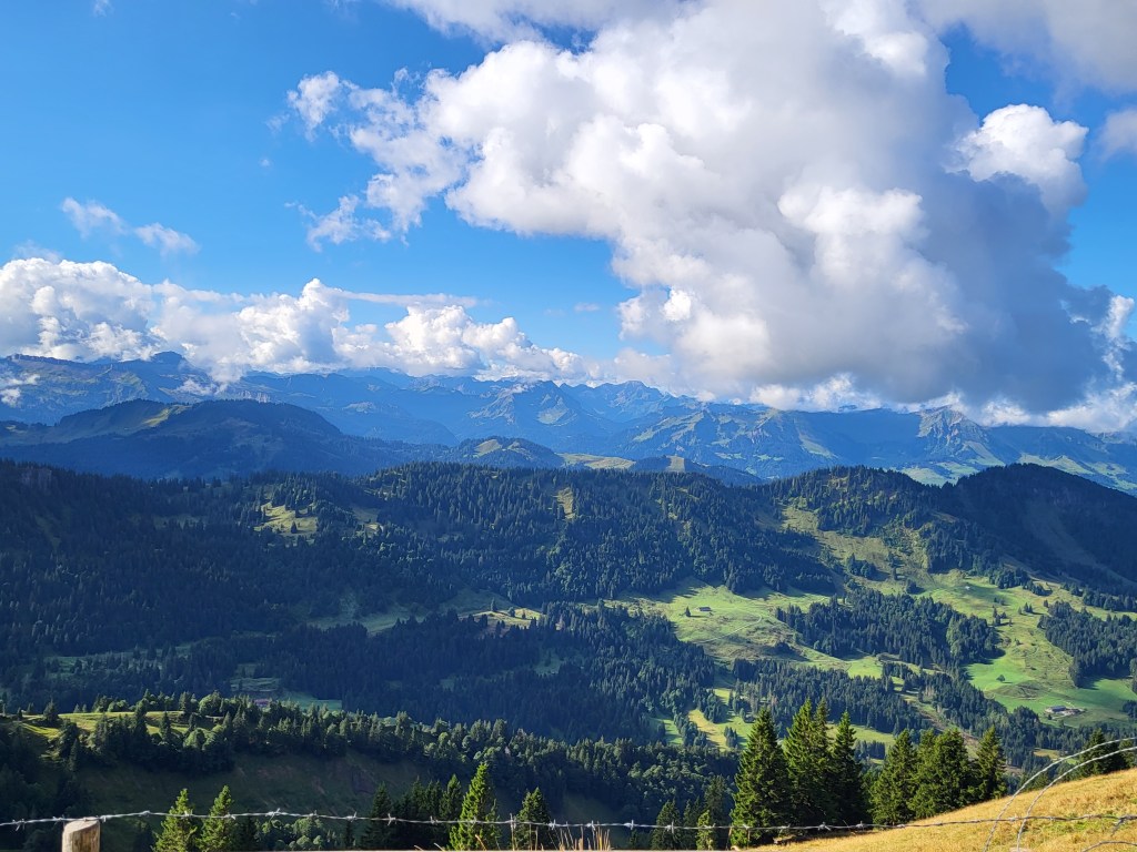 Wir kaufen Kombitickets für die beiden Bahnen und zuckeln wenig später sehr gemütlich in postgelben Mini-Kabinen nach oben zur Bergstation der Hochgratbahn. Das Wetter ist gut, aber nicht so gut (wolkenlos) wie vorhergesagt. Den Säntis sehen wir leider nicht, doch den Bodensee und viele andere Gipfel können wir ausmachen …