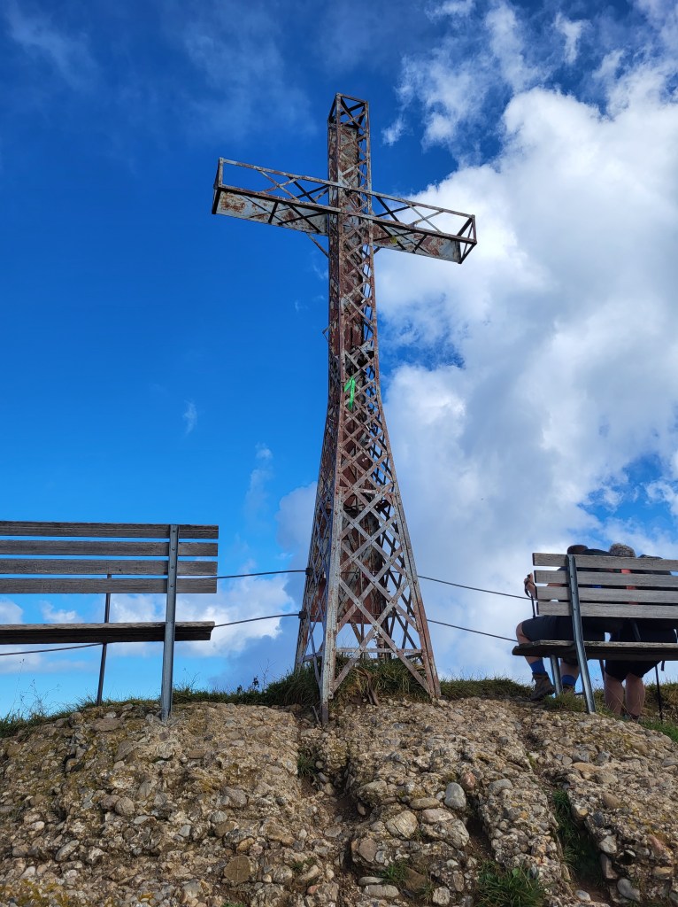 Langsam reißen wir uns vom Panorama los und starten nach Osten. Als erstes erklimmen wir den Hochgrat-Gipfel, den ersten von sieben, die vor uns liegen. Heute sind wir auf der Tour natürlich nicht allein – Sonntag, Ferien, bestes Wanderwetter. Dennoch erhaschen wir ein paar Sekunden, um das Gipfelkreuz für uns zu haben.