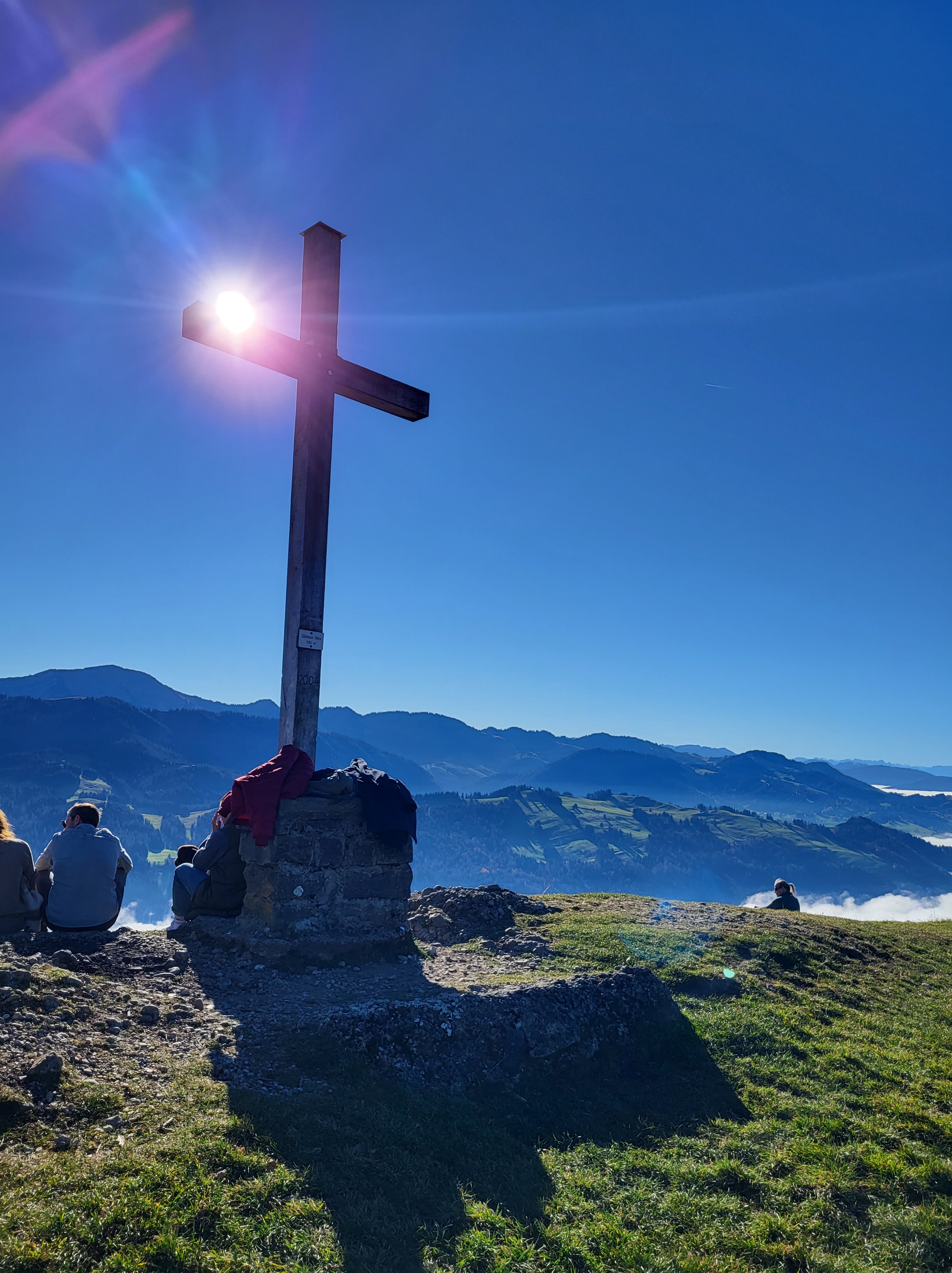 Doch vor dem Schlendern kommt erst einmal die Anstrengung, denn hoch muss man schon. Und noch ein Stück weiter vorher muss man sich entscheiden, überhaupt loszugehen, denn es ist trüb und grau. Einen Versuch ist es dennoch wert und wir wagen ihn. Wir fahren quasi in die bald neue Heimat nach Immenstadt, am Alpsee nach Wiedemannsdorf und stellen dort unser Auto ab. Gut beschildert geht es nach oben. Nach 100 – 150 geschafften Höhenmetern kommt das: