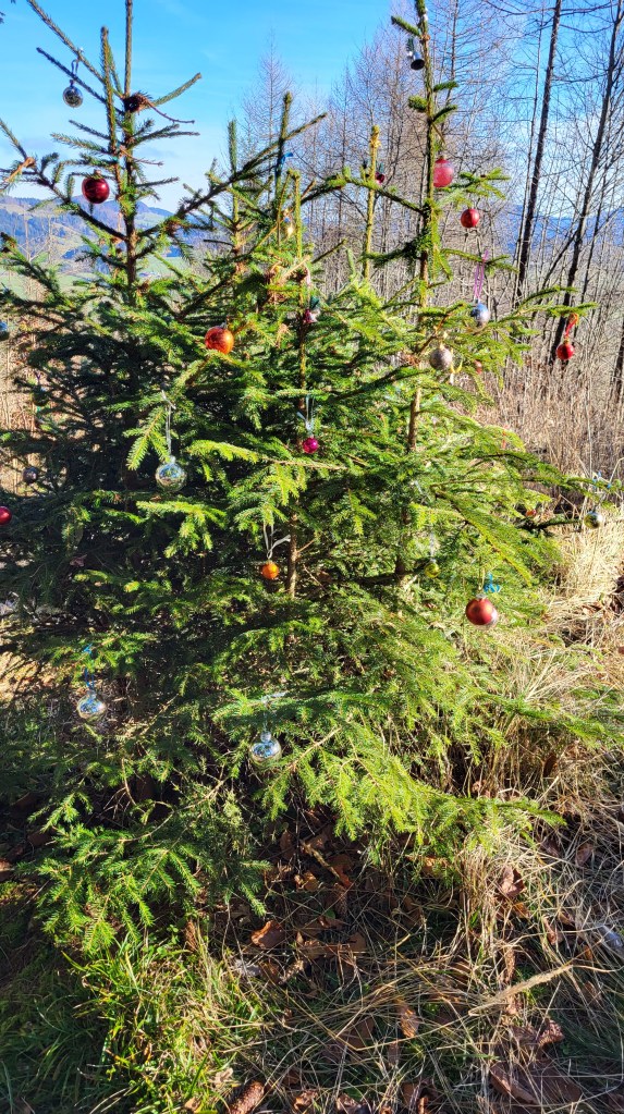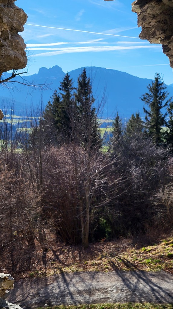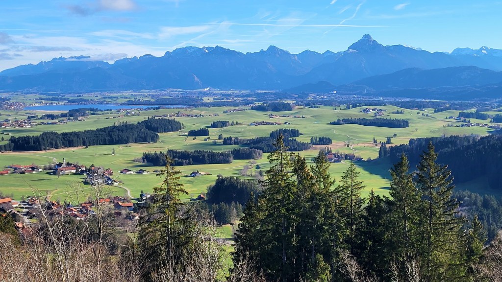 Endlich gibt es mal wieder blauen Himmel und Sonnenschein. Die Frühlingsluft gibt es gleich mit dazu und da das Gute ja bekanntlich nah liegt, haben wir unser Ziel fast jeden Tag vor Augen. Auf zwei Hügeln liegen die beiden Burgruinen Hohenfreyberg und Eisenberg. Den Ausgangspunkt haben wir schnell erreicht. Wie vorgestern auch, gibt es die Hälfte der 400 hm der Runde gleich am Anfang. Schnell geht es hinauf zum Drachenköpfle (1.009 m), welches mit einem riesigen Gipfelkreuz aufwartet und auch noch mit zwei geschmückten Weihnachtsbäumen.