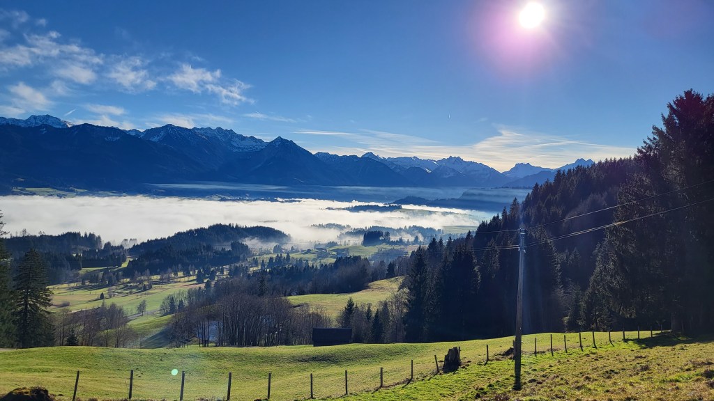 Nach einer Stunde Gehzeit kommen wir von unserem Sträßchen auf einen Waldpfad und sehen dann auch schon das Gipfelkreuz des Rangiswanger Horns. Der Untergrund liegt uns mehr und hier ist auch eine Option erkennbar, nicht den supersteilen Aufstiegsweg wieder zurück zu gehen. Aber erst geht es nordseitig aufwärts und zumindest hier merken wir, dass Winter ist. Der Boden ist gefroren und es liegt etwas Schnee. An den Ecken, wo die Sonne hinkommt, ist es richtig matschig-seifig. Da ist Vorsicht geboten. Die letzten Höhenmeter sind schnell gemacht und der Grasrücken bietet genug Platz für die vielen Wandrer, die heute hier sind. Aber vorallem verzaubern dieser Berg und das Wetter mit einer Aussicht, die keinen Wunsch offen lässt. Wir sehen alle Großen der Allgäuer Hochalpen und können bis in die Schweiz zum Säntis schauen. Die von mir heiß geliebte Nagelfluhkette sehe ich mal im Ganzen und freue mich schon, sie im Sommer wieder zu gehen. Unsere schnapstrinkenden Wanderhelden haben es auch geschafft und unterhalten alle Anwesenden hier oben.