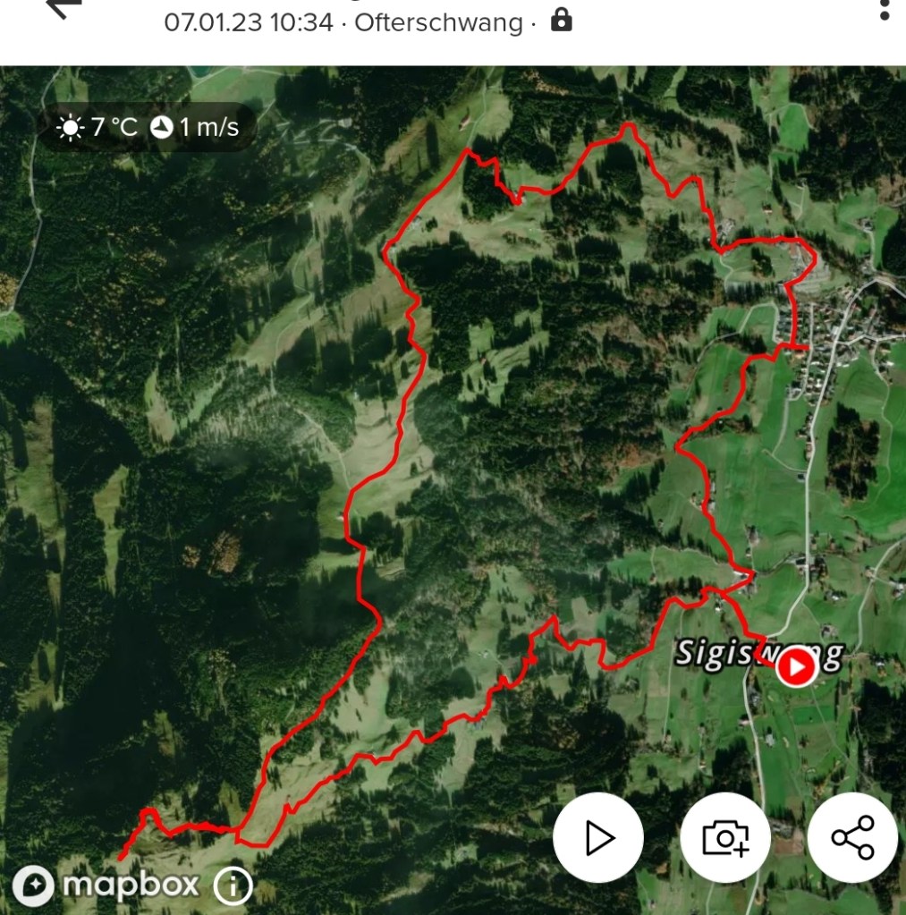 Nach einer ausgiebigen Brotzeit treten wir beflügelt den Rückweg an und entscheiden uns, in Richtung Ofterschwang abzusteigen. Eine gute Idee. Erst schlendern wir auf einem Panoramaweg in nördlicher Richtung auf das Ofterschwanger Horn zu. Die paar Meter zum Gipfel schenken wir uns und laufen hinüber zur Bergstation des Weltcupexpress von Ofterschwang. Zwei weiße Bänder ziehen sich den Hang hinab und dienen vor allem den Tourengehern für die Abfahrt. Es hört sich sehr vereist an und sieht nicht nach Spaß aus. Ich bin froh, um meine Wanderschuhe unter den Füßen. Das ist zur Zeit vermutlich mehr Spaß. Die Hütten unterwegs haben durch das herrliche Wetter und die vielen Wanderer genügend Zulauf und es kommt etwas Aprèsski-Feeling auf. Wir kehren dennoch nicht ein und laufen hinab nach Ofterschwang. Jetzt fehlen uns nur noch ein paar hundert Meter hinüber zum Auto, denke ich. Der Wanderweg geht erst noch einmal stramm aufwärts, um dann hinter den Häusern hinüber nach Sigiswang zu führen, wo wir die mühsam gewonnenen Höhenmeter wieder absteigen dürfen. Das hätte es nicht gebraucht. Dennoch: Das Wetter, die Aussicht, der ganze Tag – ein herrliches Gefühl und wir werden nicht müde, es immer wieder zu sagen, dass wir heute Glückskinder waren.