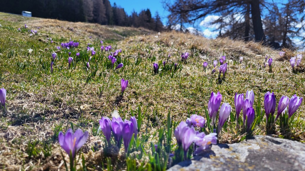 Jetzt kann es losgehen. Auf dem Weg Nr. 2, der auf der gegenüberliegenden Straßenseite startet, geht es los und auch gleich aufwärts. Durch ein paar Höfe hindurch gelangen wir in den lichten Wald und steigen über schöne – uns bekannte – Pfade in Richtung Wurzer Alm aufwärts. Ab und zu gibt es Ausblick in Richtung Ifinger und Meran 2000. Es ist eine schöne Mischung an der Grenze zwischen Winter und Frühling. Im Schatten ist der Boden noch gefroren und es liegen hier und da noch Schneereste. Auf den Wiesen in der Sonne blühen die Krokusse um die Wette.