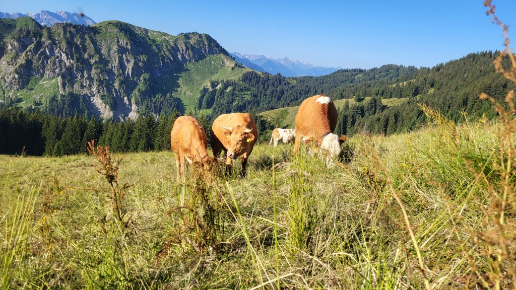 Unterhalb des Gipfelaufstiegs ist eine riesige Herde mit Jungkühen gerade beim Frühstück. Es ist ein Konzert, da keine Kuh liegt und alle Glocken bimmeln. Wir laufen mitten durch die Herde und genießen den Ausblick in nahezu alle Richtungen.