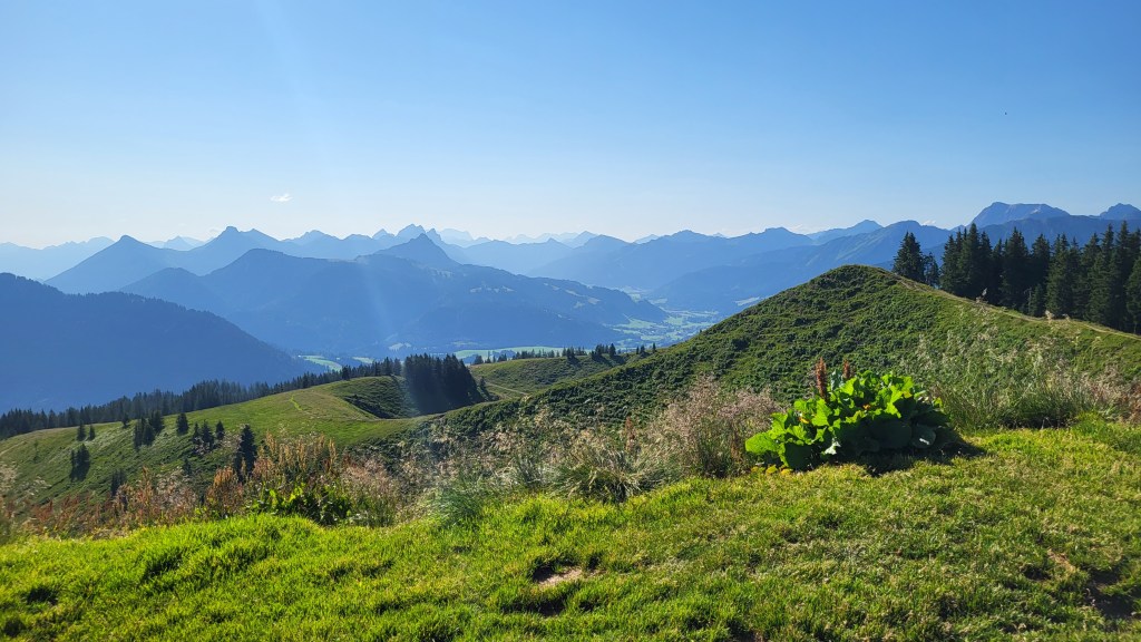 Aber im Vergleich mit anderen Regionen geht das ja fast noch als Sommerfrische durch. Was könnte helfen? Frühes Aufstehen, also sehr frühes Aufstehen. 7:00 Uhr stehen wir beide abmarschbereit am Parkplatz Obergschwend und nehmen das Wertacher Hörnle in Angriff – wir wissen gut, was uns erwartet und können vielleicht noch blühende Almrosen sehen. Auch wenn ich nicht zu den frühen Vögeln gehöre, es war die beste Entscheidung. Es ist angenehm, als wir über die Wiese aus dem Ort aufsteigen und wir sind ganz allein, was sich auf dem gesamten Aufstieg auch nicht wirklich ändern wird.