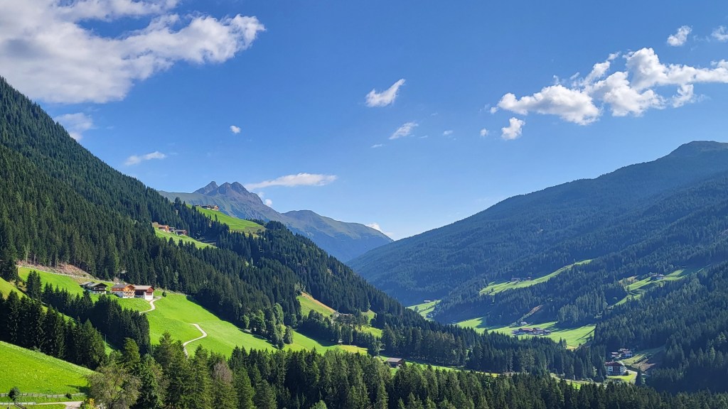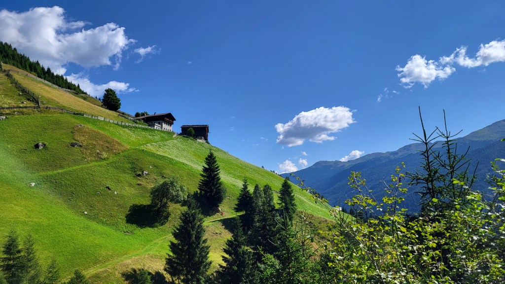 Los geht es entlang der Talfer auf dem Radweg in Richtung Aberstückl und dort auf einer schmalen Asphaltstraße über mindestens 3 Kilometer und 300 hm hinauf zu den Bergbauernhöfen, die an den steilen Hängen kleben. Sehr interessant zu sehen, weniger schön zu laufen. Die Sonne heizt schon ordentlich ein und es weht nicht einmal ein kleines bisschen Wind. Kurz vor dem Wanderparkplatz geht es links auf einen Weg, der dann endlich zum Sagenweg führt, auf den ich schon ewig hinlaufe. Ich steige hinab in eine Schlucht und auf der anderen Seite wieder hinauf. Ab dort begleiten mich neun Sarntaler Sagen bis zur Durralm. Ich habe ja unglaublich viel Zeit und lese sie alle. Nach der Durralm geht es immer noch auf breiten Wegen im schattigen Wald bis zur Kaserwiesalm, die idyllisch unter dem Kesselwandjoch und der Essenbergspitz liegt.