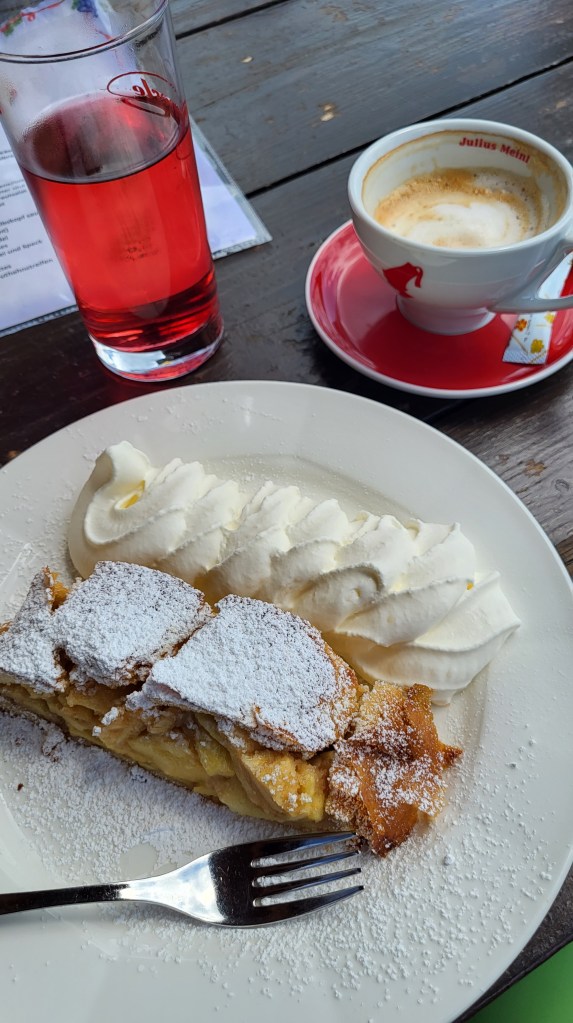 Dann sehe ich doch jemanden, der Chef, wie sich herausstellt. Seine Frau hat eine dringende Untersuchung in Meran und er muss sie fahren. Er lässt mich in mein Einzelzimmer (!) und vertröstet mich auf das Abendessen 19:30 Uhr. Na gut, dann muss ein Plan B für das Mittagessen her. Aber erstmal frisch machen, denn jetzt ist noch Ruhe im Haus. Dann – sauber und in frischen Klamotten – entscheide ich mich, dass ich heute nicht mehr laufen mag. Ich weiß auch wie ich es bewerkstellige, etwas zu Essen zu bekommen und das mit nur einer überschaubaren Anzahl von Schritten. Ich laufe hinab zur Mittagerbahn, kaufe mir für faire 7 EUR eine Berg- und Talfahrt und genieße wenig später auf der Mittagerhütte einen Apfelstrudel mit einem Hauch von Dolomitenblick. Dann schwebe ich satt und glücklich wieder hinab.