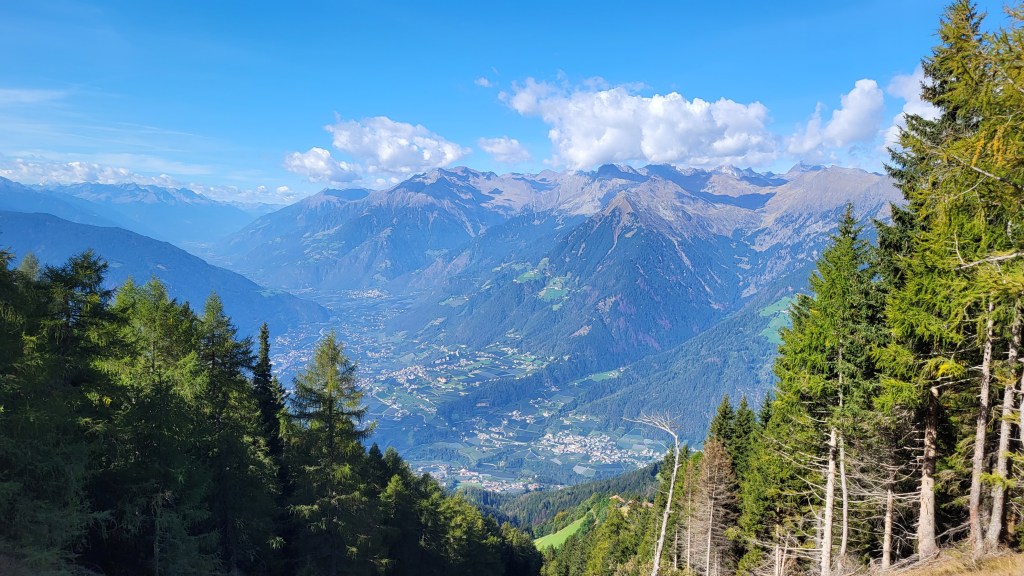 Damals ist meine Mama hier zurückgeblieben und zum Taser zurückgelaufen, da der Rücken nicht so wollte und wir sind zu dritt weiter. Heute suchen wir uns den Weg zu zweit und stolpern auch wieder über die zum Wanderführer abweichende Wegnummerierung. Auf dem Weg 24 laufen wir am Hang aufwärts in Richtung Lenzeben. Jetzt gibt der Wald ab und an Ausblicke nach Meran und ins Vinschgau frei.