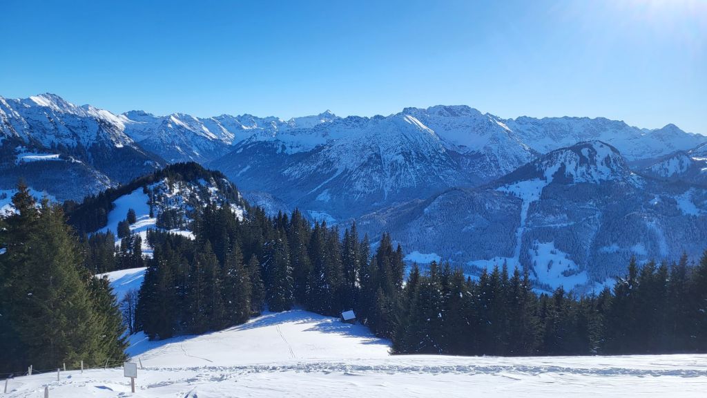 Abwärts geht es mit Schneeschuhen immer rasend schnell – ein großer Spaß. Und in wenig mehr als einer Stunde bin ich schon wieder unten. Weniger als die Hälfte der Aufstiegszeit und noch mehr Aussicht, da ich das Gesicht nicht nur am Berg habe.