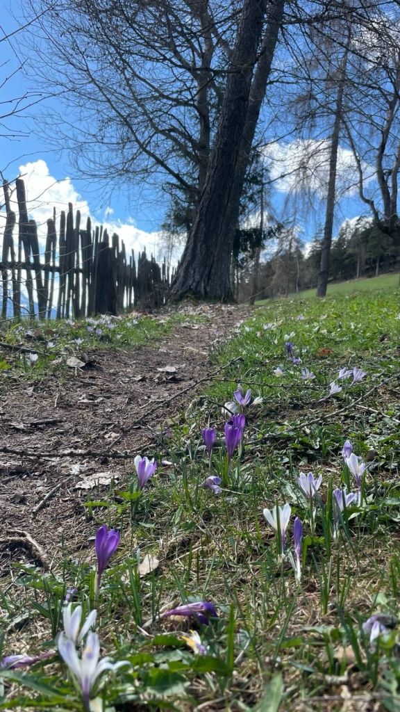Es geht leicht ansteigend im Wald hinauf zu einem kleinen Speichersee, der in der Sonne glitzert. Danach wandern wir mal über Schneefelder, mal über ziemlich nasse Waldwege aufwärts – mal gemütlich ansteigend, mal etwas steiler. Nach etwa 45 Minuten kommen wir auf einen Forstweg, der linkerhand zur Sattlerhütte führt. Noch ist alles geschlossen hier oben, aber da wollen wir auch nicht hin. Wir zweigen bald rechts ab und steigen zu den Krokuswiesen am Möltner Joch hinauf. Ostern letztes Jahr war hier ein Blütenmeer aus violett und weiß – heuer ist es viel weiß … Schnee. Dennoch kämpfen sich die ersten Krokusse ihren Weg und wenn man genau hinschaut, sieht man ganz viele Ansätze, die sicher Ende der Woche vollständig aufgeblüht sind.