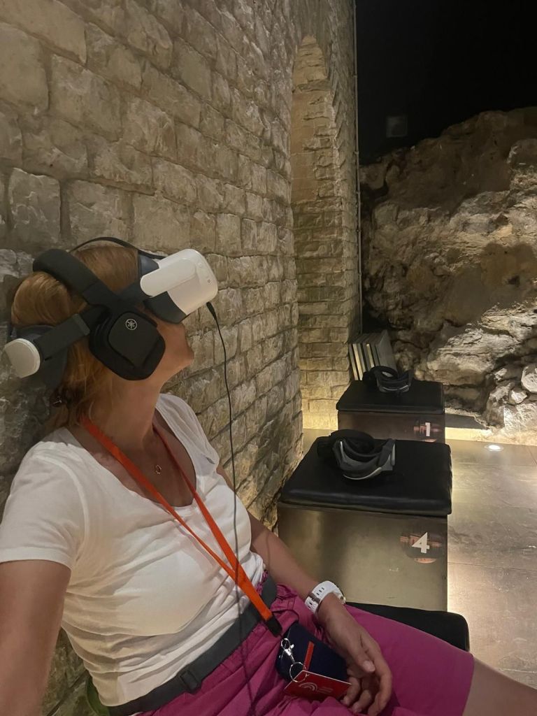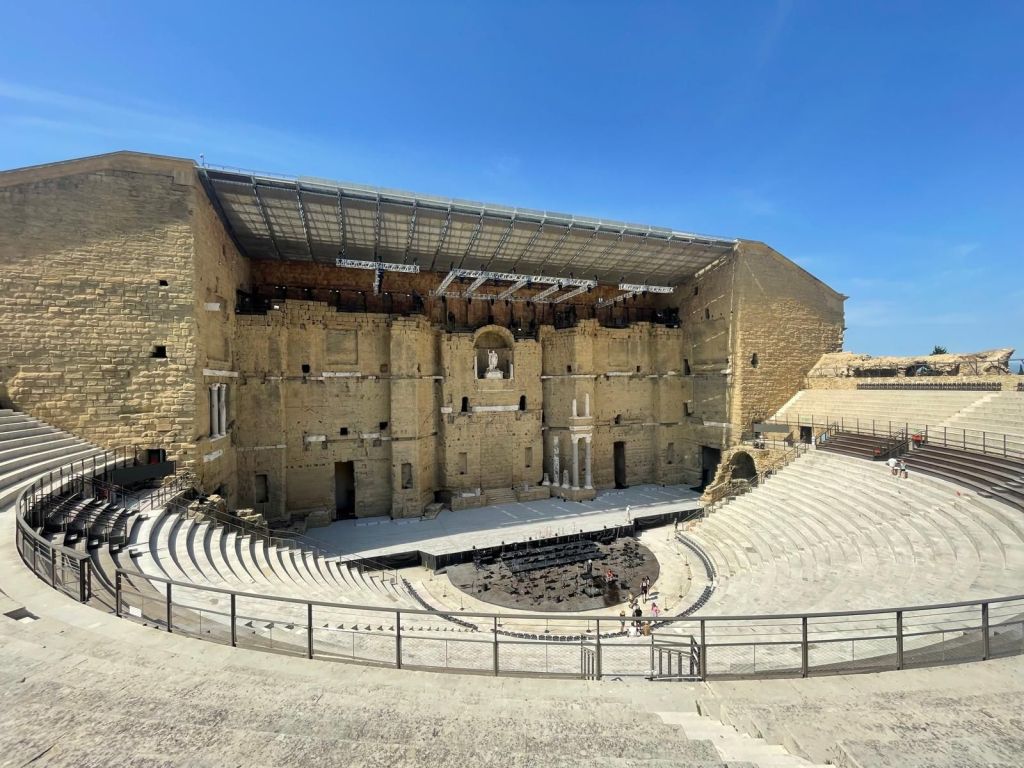 Weiter geht es jetzt nach Orange ins antike Theater. Es ist inzwischen wieder brütend heiß, doch etwas Kultur muss sein. Gerade als wir ankommen beginnt eine „augmented reality“ Vorführung und die nehmen wir auch gleich mit. Ausgestattet mit aller Technik befinden wir uns jetzt mitten im Theater, wie es früher einmal ausgesehrn haben könnte. Sehr spannend, informativ und vor allem auch kühl in dem Raum.