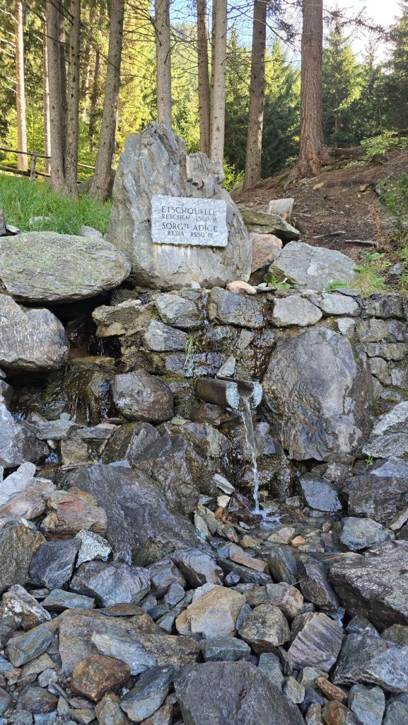 Bisher sind wir eher schnell durchgefahren oder haben maximal einen Fotostopp gemacht und jetzt sind wir – wenn auch nur für eine Nacht – mal hier. In einem wirklich sehr schönen Hotel genießen wir einen entspannten Abend mit wirklich einigen kulinarischen Highlights und ein wunderbares Frühstück am Sonntag. Da der Winter oben in den Bergen bereits Einzug gehalten hat, was nach der 8-Grad-und-Regen-Woche in München kein Wunder für hier ist, bleiben wir etwas weiter unten. Das dürfte bei der Wanderung auch kein wirklicher Nachteil sein, aber wir werden sehen. Wir starten direkt am Hotel zu unserer auf der Ostseite des Reschensees und laufen erst einmal zum Sportplatz, der oberhalb des Dorfs, fast schon im Wald liegt. Dort geht es in einen Wanderweg zur Etschquelle über. Damit hatte ich überhaupt nicht gerechnet. Es ist ein kleiner Abstecher von wenigen Minuten, an einigen kleineren ehemaligen Bunkern vorbei.